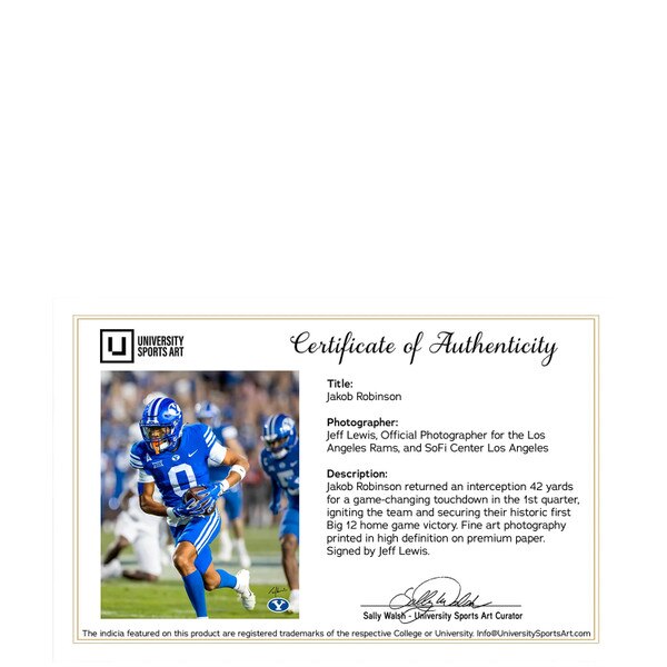Jakob Robinson - 16" X 20"ID1672565 (0) No Reviews yet $64.00 Quantity discounts available QuantityPrice SKU: 16 X 20 Jacob Robinson Quantity -+ Add to Cart Details 16"W x 20"HNumbered Edition of 175 PrintsFine Art printing on premium archival paper with archival inkOfficially licensed by NCAA & BYUUniversity Spor... DetailsBackDetails16"W x 20"HNumbered Edition of 175 PrintsFine Art printing on premium archival paper with archival inkOfficially licensed by NCAA & BYUUniversity Sports Art signed statement of Authenticity is includedMade in the USAShips rolled in an art tube.See MoreSee Less Reviews 0 BackRatings & ReviewsNo reviews availableBe the first to Write a Review